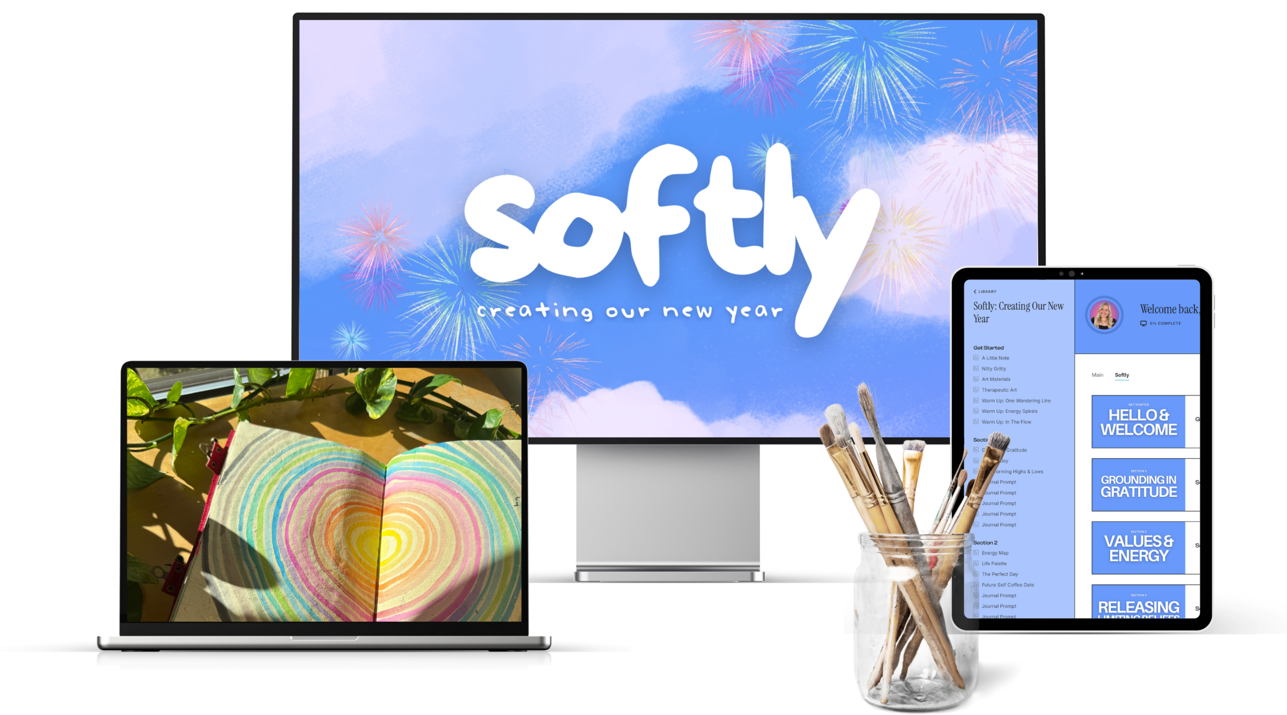 Softly is a gentle, art-therapy–inspired New Year reflection and embodiment journey. Instead of setting rigid goals or forcing resolutions, you’ll move through creative prompts and journaling to reconnect with your inner world, release limiting beliefs, and create intentions rooted in softness, authenticity, and self-compassion.