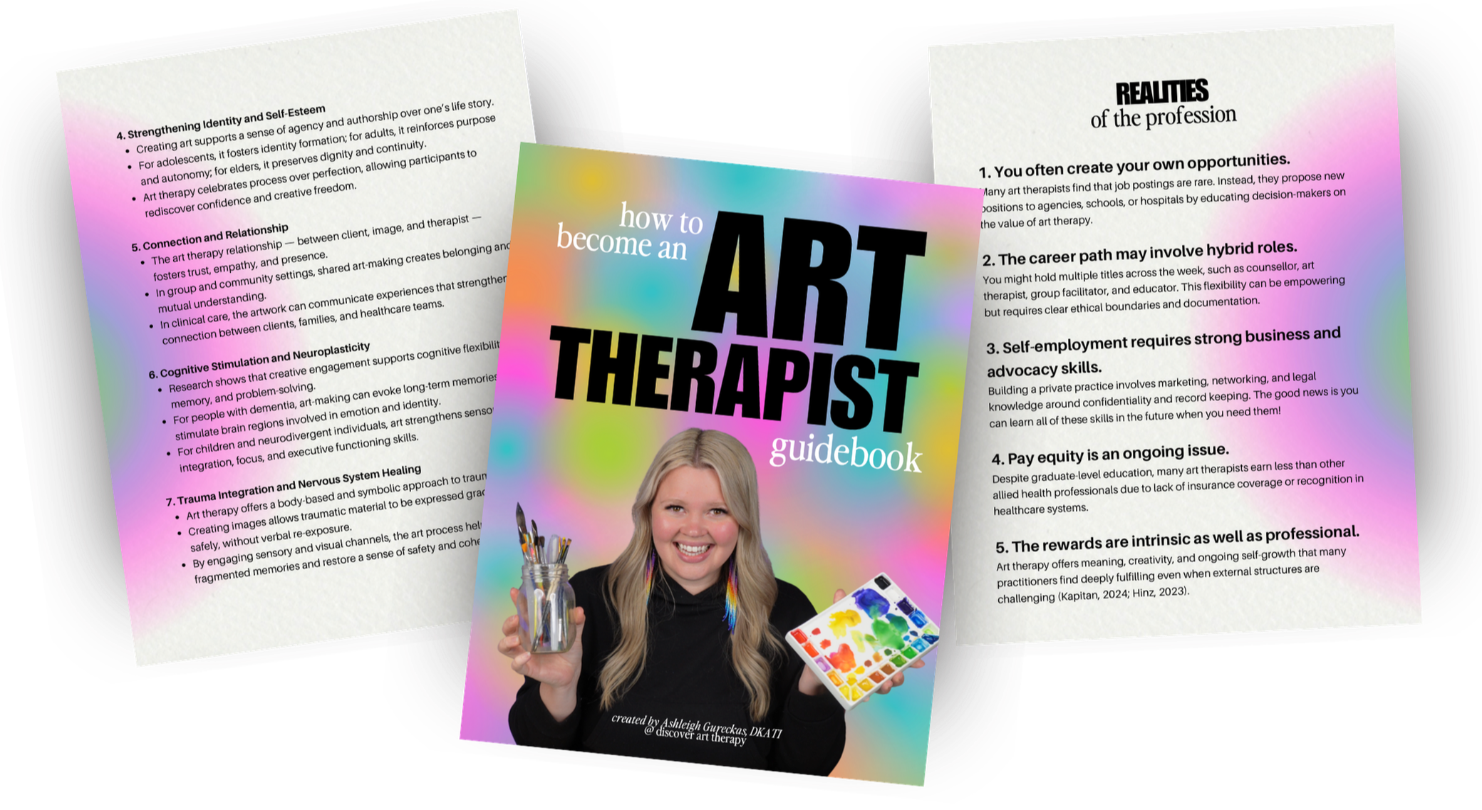 A professional Canadian art therapist and the founder of Discover Art Therapy with over 200K followers. A graduate of the Kutenai Art Therapy Institute, private practise owner, and former instructor.